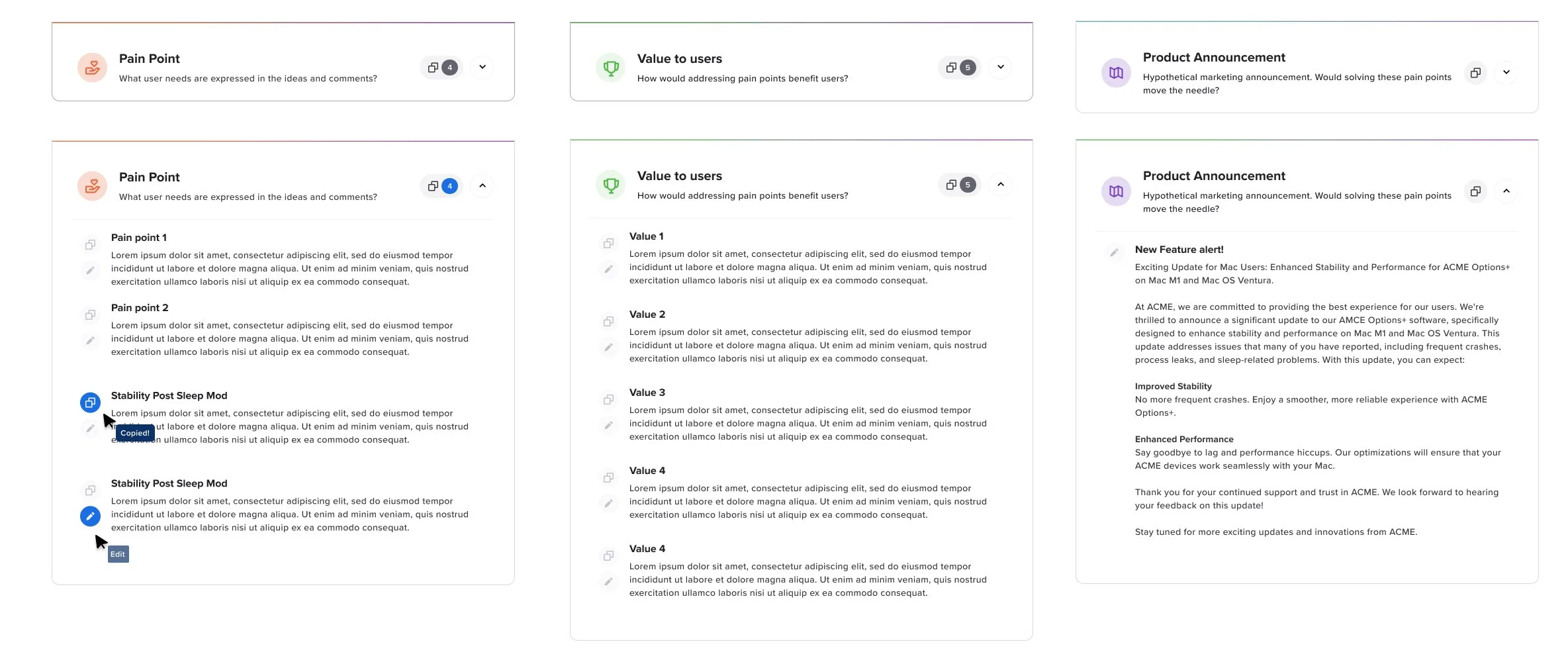 I prioritized Information Portability—implementing one-click section copying and high-fidelity exports to ensure the "Voice of the Customer" could easily move into JIRA, Slack, or executive slide decks.