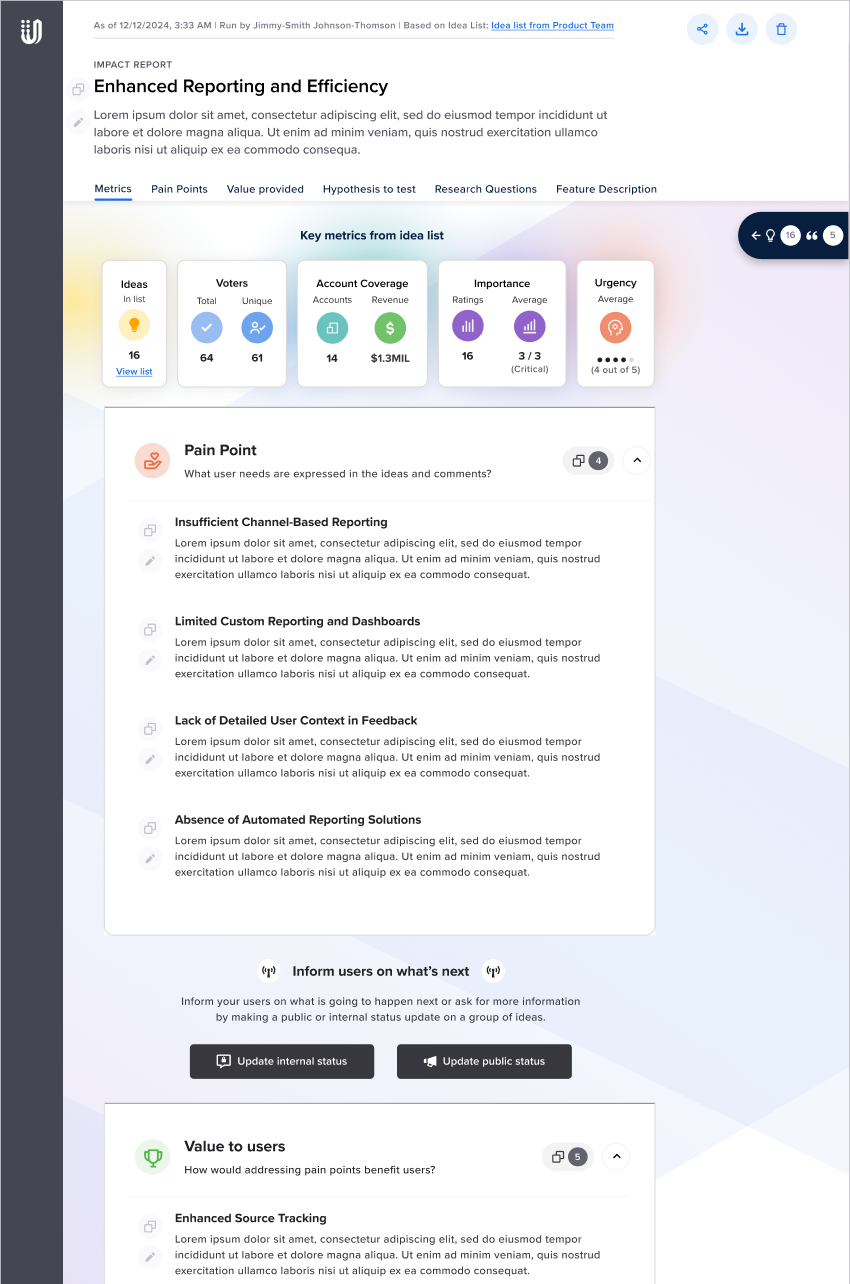 A primary goal was to ensure insights were never siloed. I architected the flow so that Impact Reports, Theme Reports, and Idea Lists lived within a single, linked ecosystem. To bridge the gap between discovery and action,